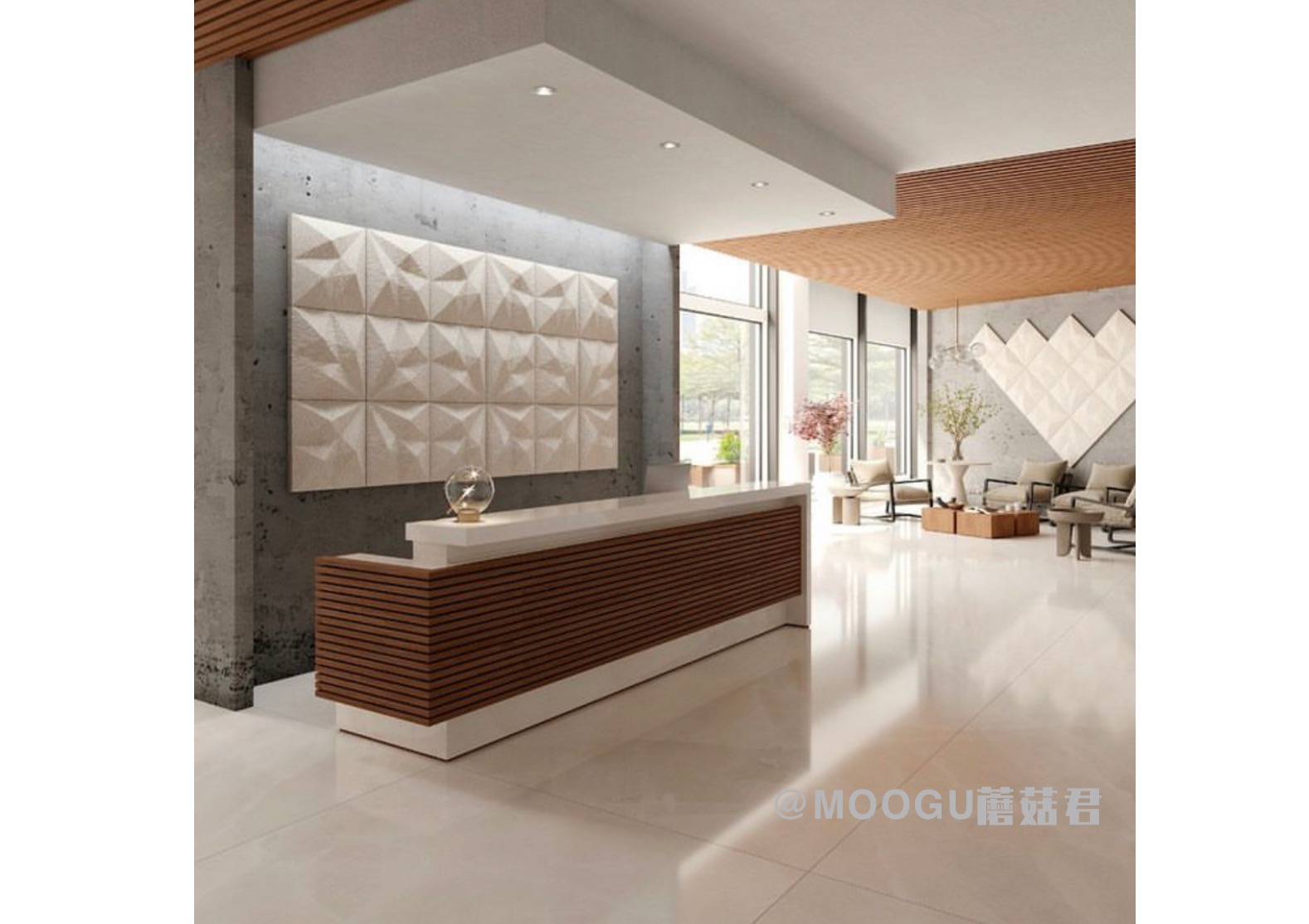 MOOGU轻薄墙面声学美饰面板具有吸音性能。一个革命性的全新系列,完全环保的面板,将惊人的自然技术与人类的聪明才华和工程学相结合。一款开创性产品,能够为所有内饰提供创新和自然的外观,同时凭借其独特的美学和声学性能改善酒店、商场、办公室的舒适性。