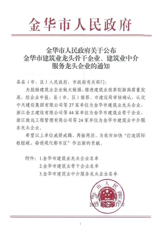 近日,金华市人民政府公布了金华市建筑业龙头骨干企业、建筑业中介服务龙头企业的名单,我司与其他共计24家企业获得“建筑业中介服务龙头企业”荣誉称号。